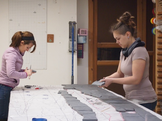 Gigi and Rachel trimming tiles and mapping the mural.