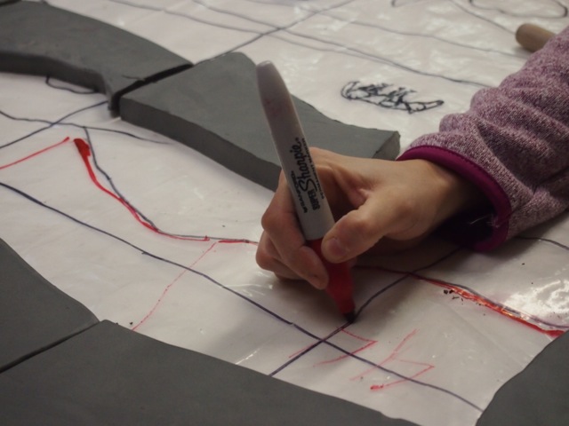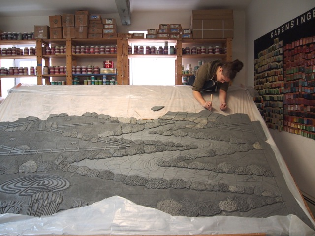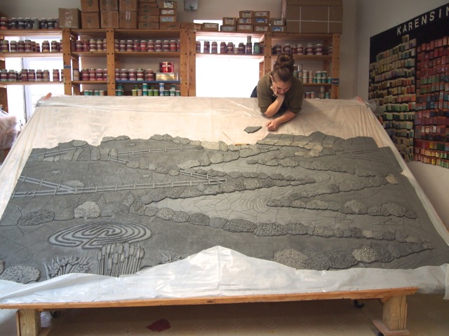 A sneak peek into our studio today! We are working on a custom ceramic tile donor recognition mural for Capital Caring. The 14′ x 7′ ceramic mural will be installed in the main entry area of the Adler Center. The work will be a bird’s eye view landscape featuring an undulating river. In the background will be the Shenandoah Mountains and the Washington DC skyline. Some of the symbolism include: horse farms (a reference to power and freedom), a labyrinth (reference to spiritual pathway), a sailboat and kayaks (symbolic of a safe crossing), and rapids in the river (symbolic of the challenges in life).